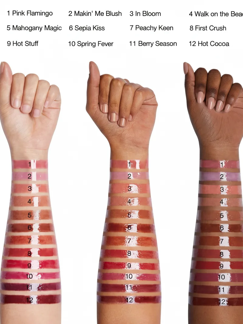 در سایه‌های متنوع عرضه می‌شود: Pink Flamingo (صورتی فلامینگو)، First Crush (صورتی ملایم)، Hot Stuff (گرم پررنگ)، Hot Cocoa (شکلاتی)، Makin’ Me Blush (صورتی بلاش)، Spring Fever (بهاری تازه)، In Bloom (گل‌دار)، Peachy Keen (هلوئی)، Walk On The Beach (ساحلی). مناسب همه تناژهای لب.